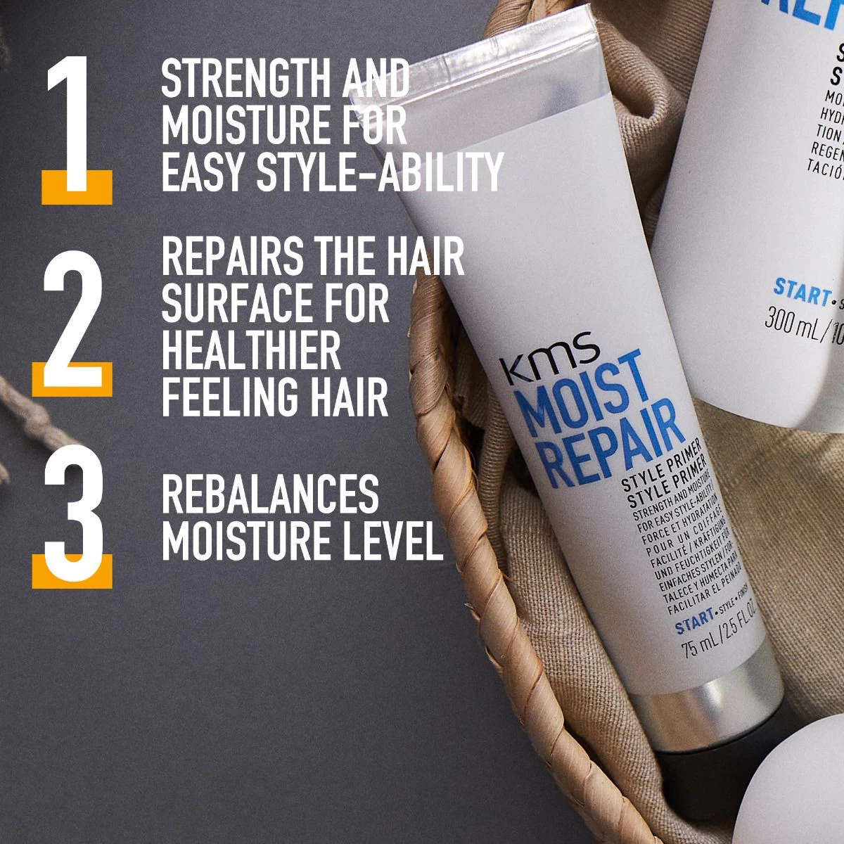 De MoistRepair Style primer van KMS is ideaal voor droog en beschadigd haar. Deze primer voedt het haar dat broos of droog aanvoelt en brengt het vochtgehalte weer in evenwicht.