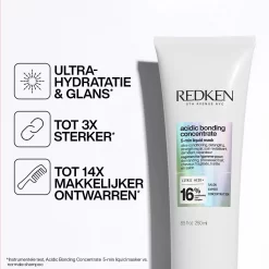 Met indrukwekkende eigenschappen, zoals tot 72 uur ultra-hydratatie en glans*, tot 3x sterker haar**, en tot 14x makkelijker ontwarren**, biedt Redken Acidic Bonding Concentrate 5-Min Liquid Masker de ultieme haarverzorging. Ervaar de transformatie van het haar en geniet van stralende resultaten in slechts enkele minuten.